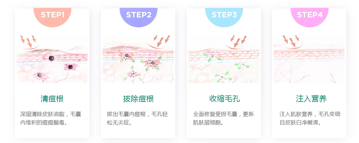 • 快速清除表面及毛囊细菌,从根本上消除顽固痘痘